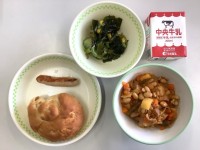 ご飯、牛乳、蒸しぎょうざ、つくねと千切り野菜のさっぱり煮、野菜の辛味あえ