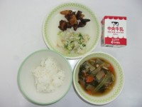 ご飯、牛乳、レバーの揚げ煮、キャベツと水菜のサラダ、大根のそぼろ汁、和風クリーミ...
