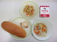 ロールパン、牛乳、鶏肉のマヨ白しょうゆ焼き(新メニュー)、大根のポトフ、れんこんのカレーソテー