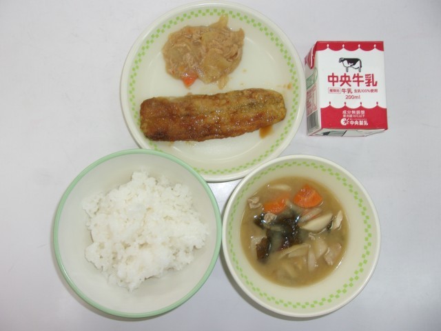 ご飯、牛乳、さんまのかば焼き、冬瓜とツナの煮物、豚汁