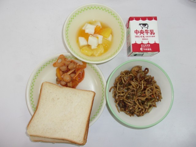 スライスパン、牛乳、焼きそば、ウインナーとれんこんのチリソース煮、アンニンドーフ