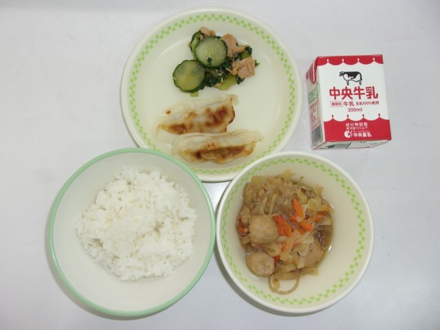 ご飯、牛乳、蒸しぎょうざ、つくねと千切り野菜のさっぱり煮、野菜の辛味あえ