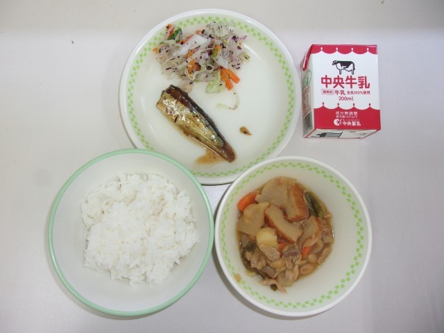 ご飯、牛乳、さんまの煮付け、鶏肉と大豆の旨煮、しそあえ