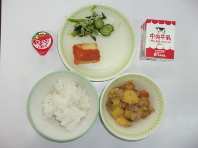 ご飯、牛乳、豆腐ステーキのもみじおろしかけ、じゃがいもの旨煮、甘酢あえ、プチアセロラゼリー