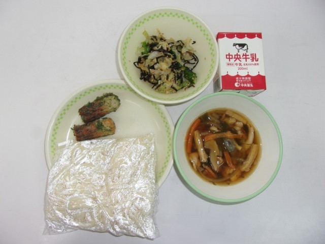 白玉うどん、牛乳、きのこうどんの汁、ちくわの磯辺和揚げ、塩昆布あえ