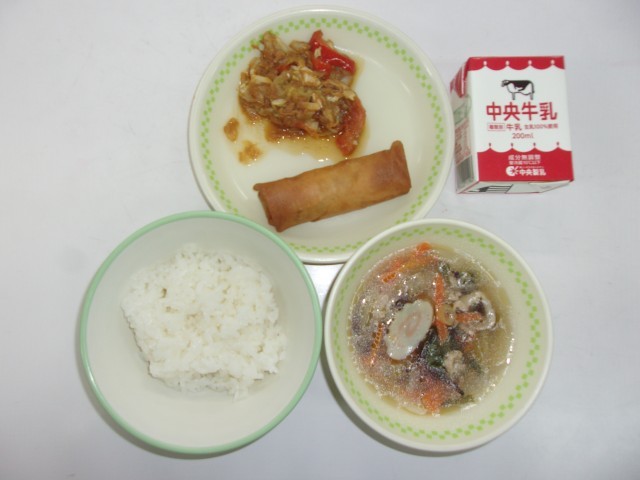 ご飯、牛乳、ツナのピリ辛みそ炒め、春巻、中華スープ