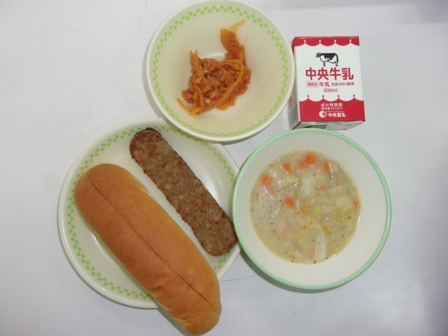 サンドイッチロールパン、牛乳、ハンバーグ、白菜のクリームシチュー、切干大根のナポリタン