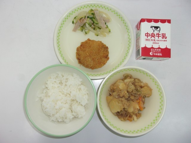 ご飯、牛乳、キャベツ入りメンチカツ、じゃがいもとツナのうま煮、大根サラダ、青じそドレッシング