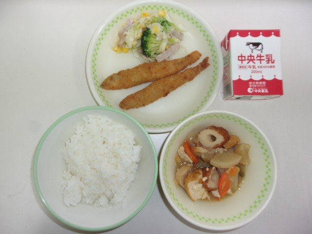 ご飯、牛乳、ししゃもフライ、関東煮、花野菜サラダ、和風クリーミードレッシング