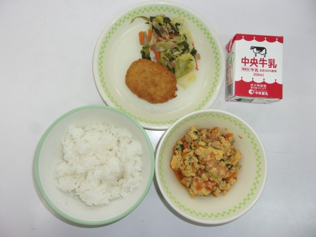 ご飯、牛乳、碧南どんぶり、和風コロッケ、愛知野菜の炒めもの