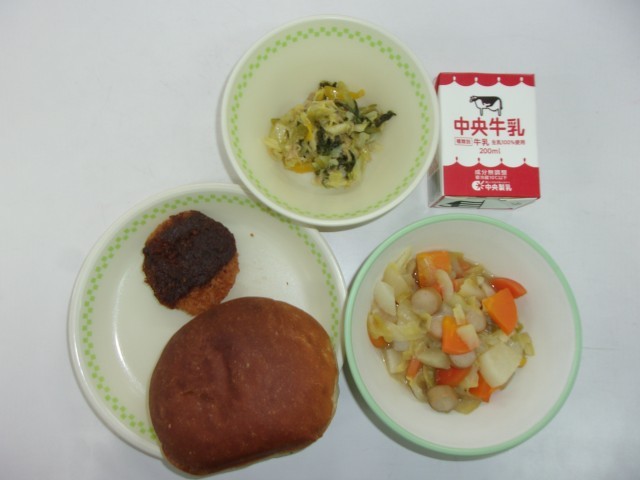 サンドイッチバンズパン、牛乳、みそかつ、大根のポトフ、野菜ソテー