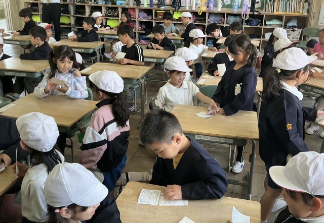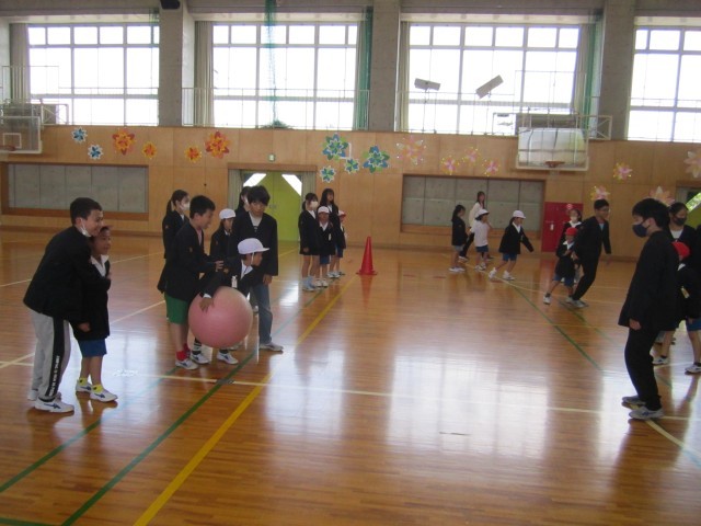 お兄さんお姉さんとまず名刺交換をして、その後体育館や運動場・教室で一緒に遊びました。