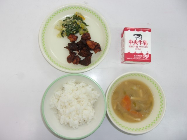 ご飯、牛乳、レバーのマリアナソース、チンゲンサイの白しょうゆ炒め、新たまねぎのみそ汁