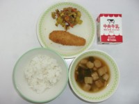 麦ご飯、牛乳、鰯の梅煮、ごぼうと豚肉の炒め物、鶏肉団子のすまし汁