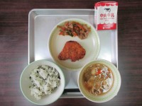 【本日の献立】牛乳・中華めん、みそラーメンのスープ、えびシューマイ、チンゲンサイのツナ炒め