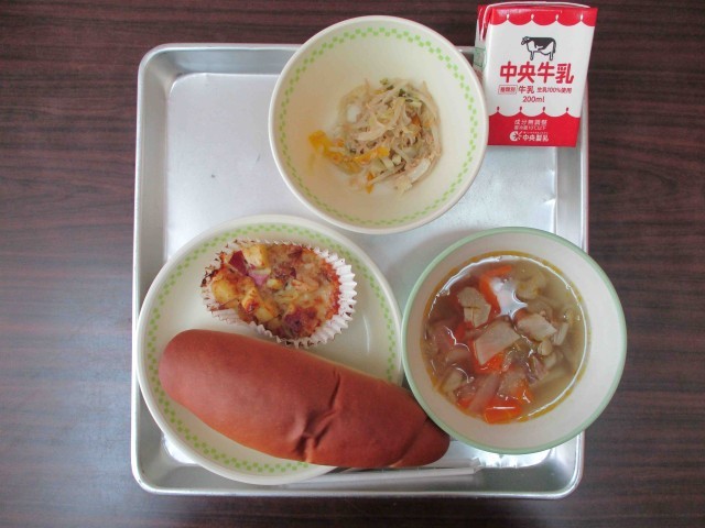 【本日の献立】牛乳・クロロールパン、鶏肉とさつまいものマヨネーズグラタン風、野菜ソテー、根菜スープ