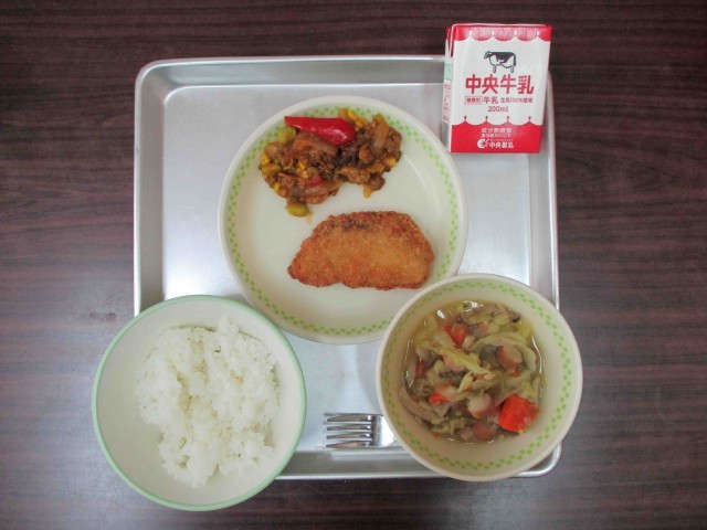 【本日の献立】牛乳・ご飯、カレーピラフの具、サーモンフライ、さつまいものポトフ