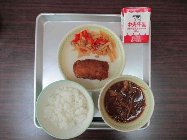 【本日の献立】牛乳・ご飯、いかフライのレモン煮、じゃがいものしゃきしゃき炒め、きのこ汁