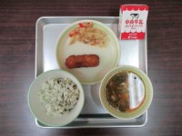 【本日の献立】牛乳・わかめご飯、ソフトカレイフライ、れんこんのきんぴら、えび団子汁