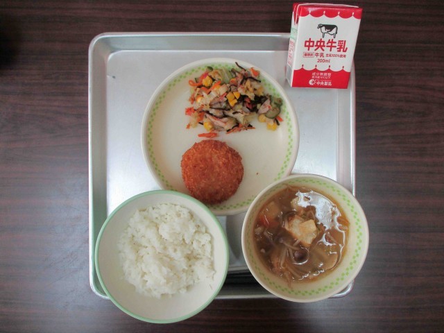 【本日の献立】牛乳・ご飯、エビカツ、りっちゃんのサラダ、湯葉のすまし汁
