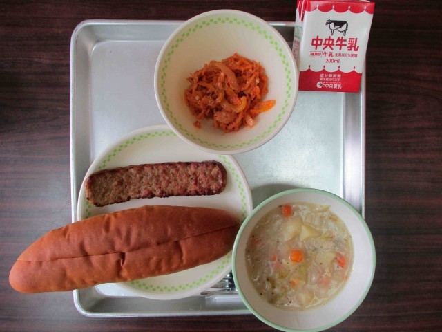 11月5日(水) 公開日 2025/11/05 更新日 2025/11/05 給食日記 【本日の献立】牛乳・サンドイッチロールパン、ハンバーグ、白菜のクリームシチュー、切干大根のナポリタン いいね(0)