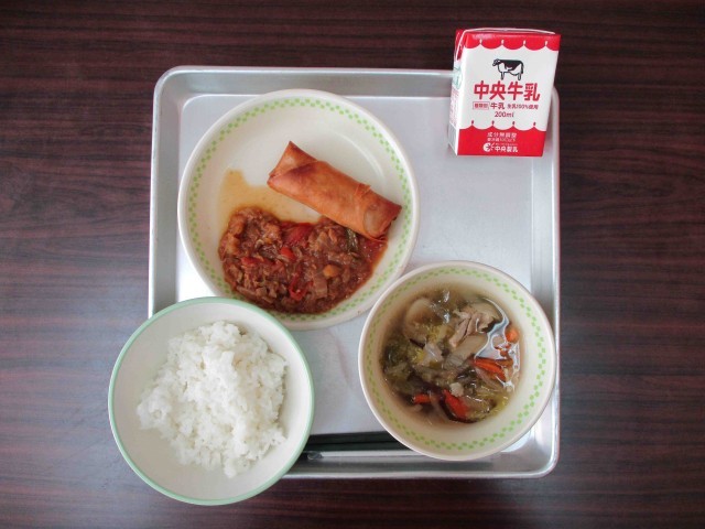 【本日の献立】牛乳・ご飯、ツナのピリ辛みそ炒め、春巻、中華スープ