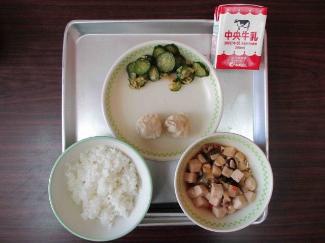 【本日の献立】牛乳・ご飯、えびシューマイ、豆腐の中華風煮、やみつききゅうり