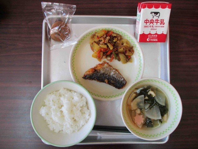 【本日の献立】牛乳・ご飯、さわらの塩唐揚げ、さつまいものきんぴら、紅葉のすまし汁、西尾抹茶のわらびもち