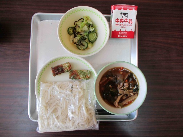【本日の献立】牛乳・白玉うどん、きのこうどんの汁、ちくわの磯部揚げ、塩昆布あえ