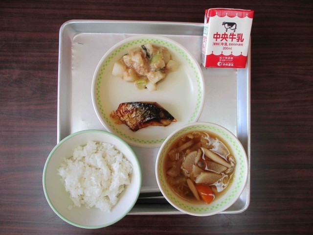 【本日の献立】牛乳・ご飯、さばの塩焼き、かぶとツナの和風あんかけ、冬野菜たっぷり汁