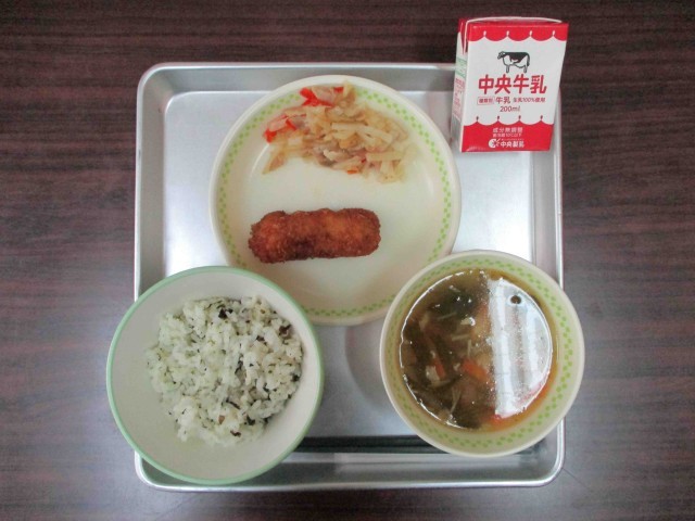 【本日の献立】牛乳・わかめご飯、いかフライのレモン煮、じゃが芋の塩炒め、はりはり汁