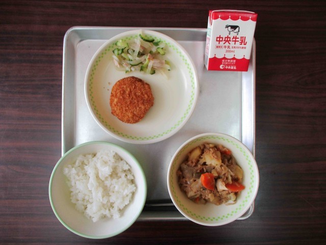 【本日の献立】牛乳・ご飯、キャベツ入りメンチカツ、じゃがいもとツナのうま煮、大根サラダ、青じそドレッシング