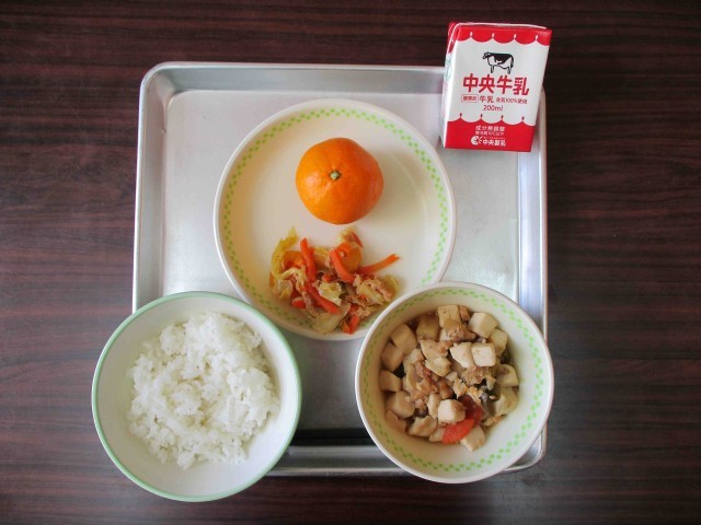 【本日の献立】牛乳・ご飯、炒り豆腐、えびと野菜のにんにく炒め、みかん