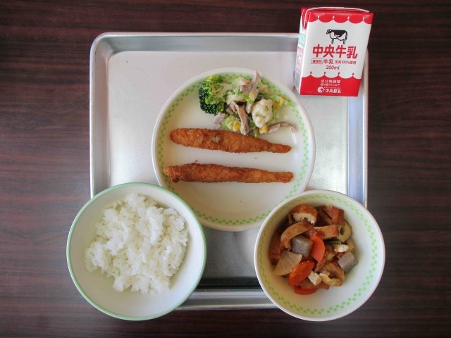 【本日の献立】牛乳・ご飯、ししゃもフライ、関東煮、花野菜サラダ、和風クリーミードレッシング