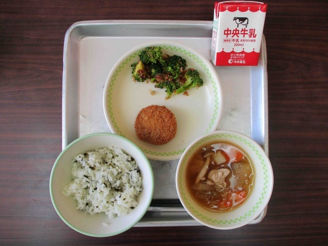 【本日の献立】牛乳・わかめご飯、とんカツ、ブロッコリーのおかかあえ、野菜たっぷり汁