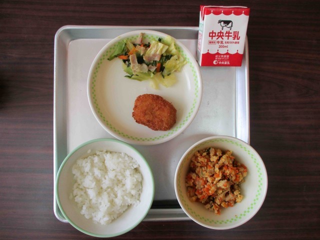 【本日の献立】牛乳・ご飯、碧南どんぶり、和風コロッケ、愛知野菜の炒めもの