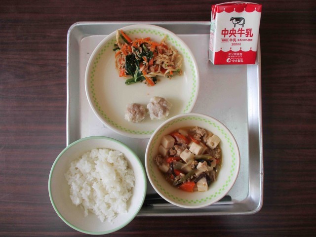 【本日の献立】牛乳・ご飯、シューマイ、豆腐の中華風煮、切干大根のナムル