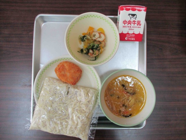 【本日の献立】牛乳・中華めん、とんこつラーメンのスープ、エビカツ、水菜の中華サラダ