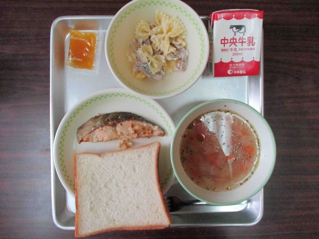 【本日の献立】牛乳・スライスパン、鮭のチーズパン粉焼き、りぼんマカロニサラダ、コンソメスープ、みかんジャム、ノンエッグマヨネーズ