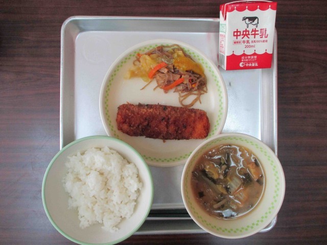【本日の献立】牛乳・ご飯、いかフライの梅ソース、こんにゃくソテー、白菜のみそ汁
