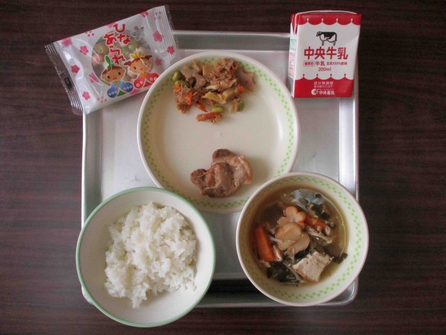 【本日の献立】牛乳・ご飯、鶏肉の甘酒みそだれ、桃の節句のふりかけ、花ふ汁、ひなあられ