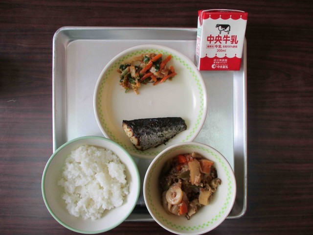 【本日の献立】牛乳・ご飯、さわらのあおさ焼き、野菜のそぼろ煮、わけぎのみそあえ、甘みそ