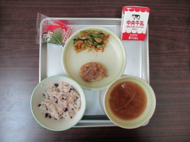【本日の献立】牛乳・赤飯、豆腐ハンバーグの桜色あんかけ、春キャベツのおかかあえ、碧南たまねぎのすまし汁、お祝いデザート