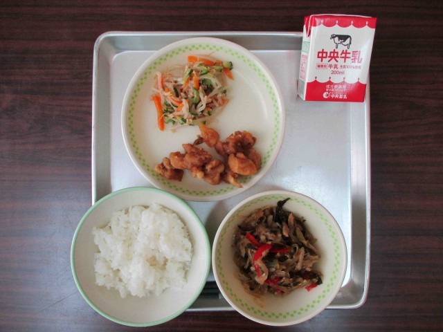 【本日の献立】牛乳・ご飯、ころころユーリンチー、チャプチェ、白だしナムル