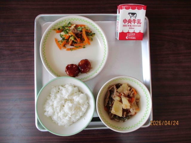 【本日の献立】牛乳・ご飯、白ごまつくね、肉じゃが、あいまぜ
