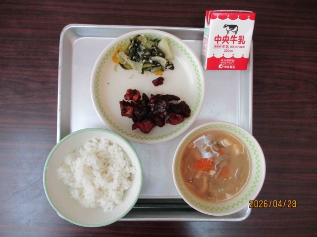 【本日の献立】牛乳・ご飯、レバーのマリアナソース、チンゲンサイの白しょうゆ炒め、新たまねぎのみそ汁