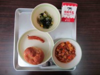 【本日の献立】 牛乳・ご飯、チヂミ、チャプチェ、チンゲンサイのナッツあえ