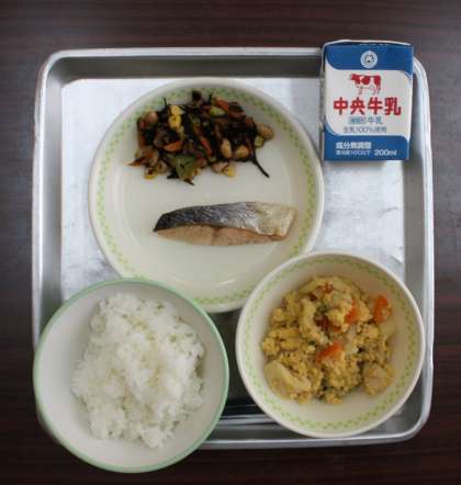 【本日の献立】 牛乳・ご飯、さけの塩焼き、親子煮、大豆とひじきのピり辛炒め