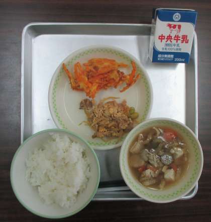 【本日の献立】 牛乳・ご飯、豚肉とキムチのたまご炒め、碧南にんじんのかき揚げ、八杯汁
