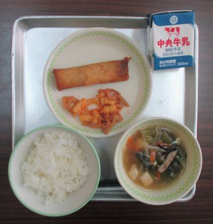 【本日の献立】 牛乳・ご飯、いかとれんこんのチリソース、春巻、豆腐とチンゲンサイのスープ